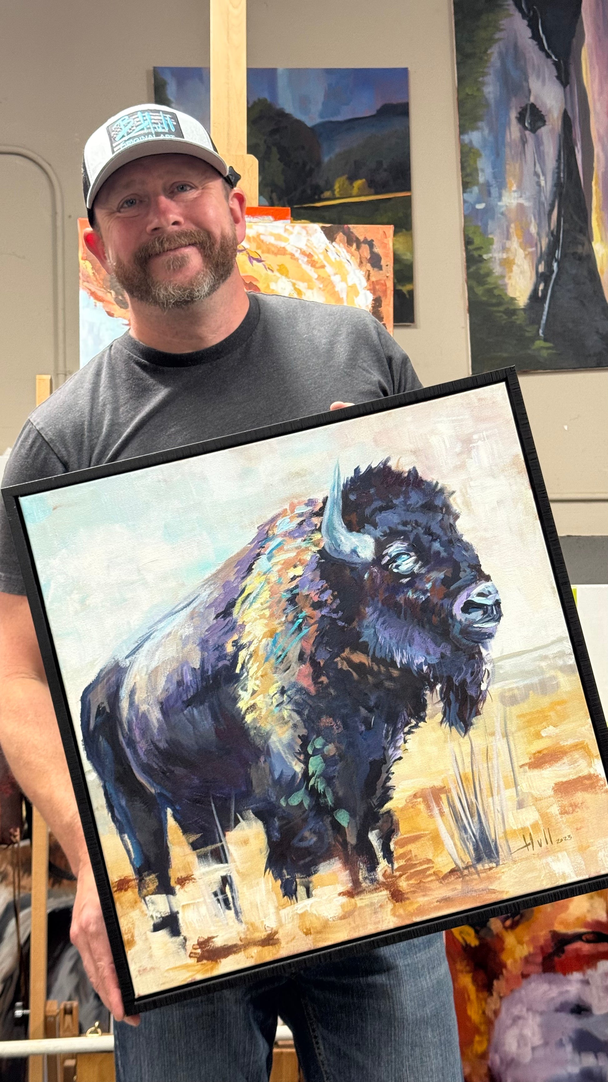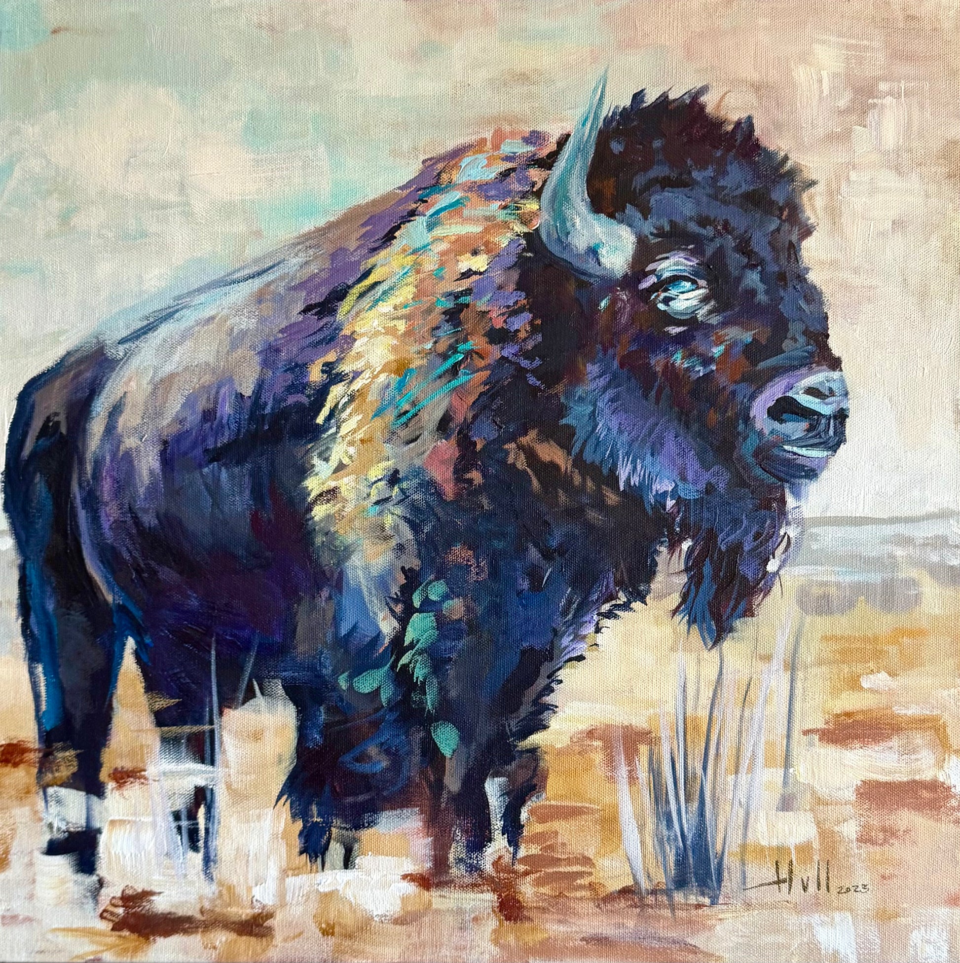 A lone bison rises from the brush with quiet authority—head bowed, hooves planted, spirit unshaken. This piece captures the grit of the West and the resilience of the soul. The bold, textured strokes echo the raw power of nature, while subtle light dances across its coat like the promise of dawn after a storm.